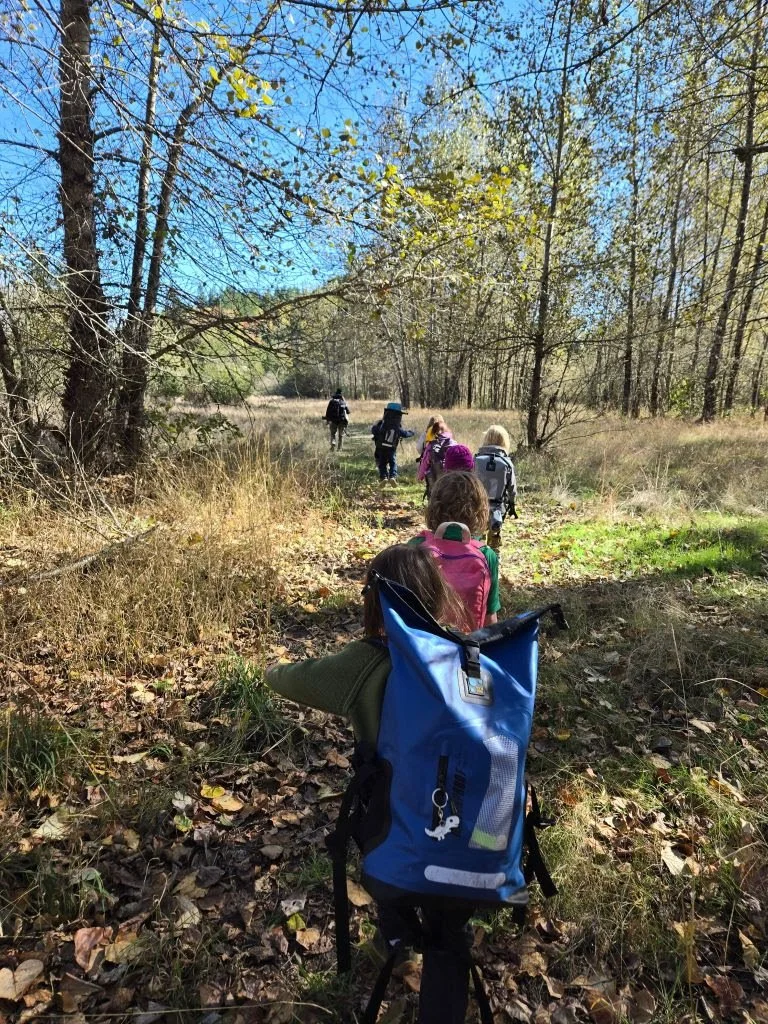 PFS students walk through a beautiful autumn forest on their way to their outdoor classroom.